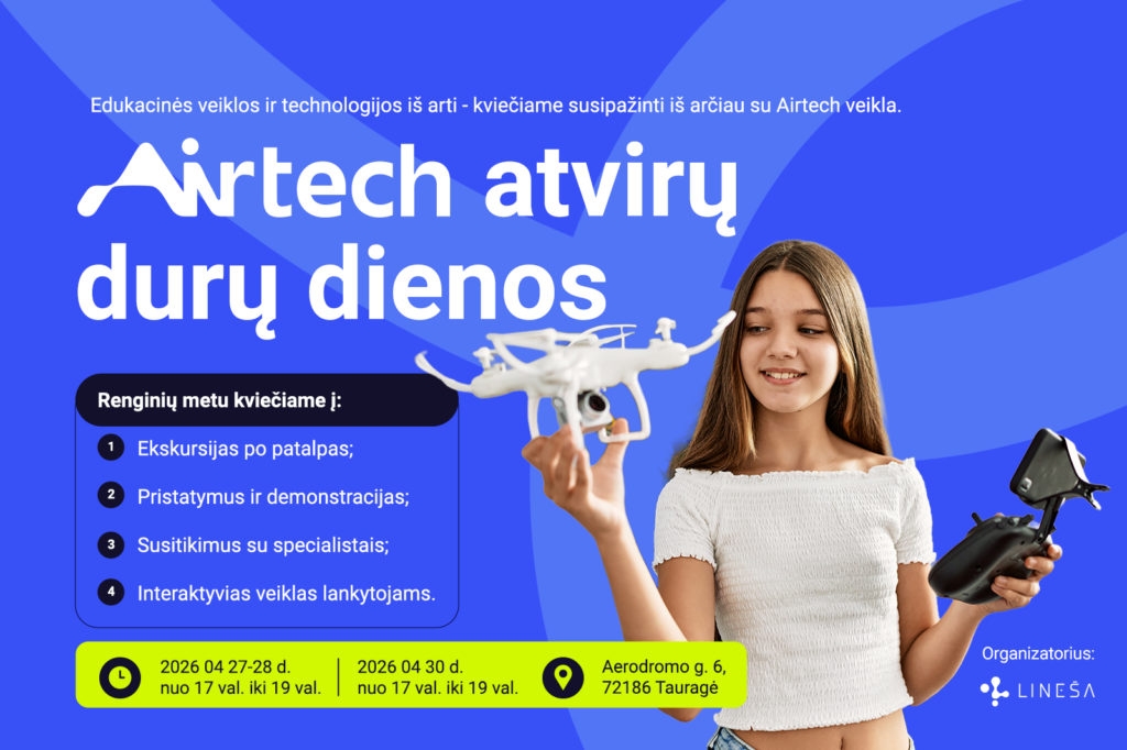 Balandžio pabaigoje Tauragėje gyventojai turės galimybę iš arčiau susipažinti su inovatyvia veikla, kuri kasdien vyksta Lietuvos neformaliojo švietimo agentūros „Airtech“ metodiniame centre. Čia durys bus atvertos visiems, besidomintiems technologijomis ir šiuolaikiniu ugdymu.