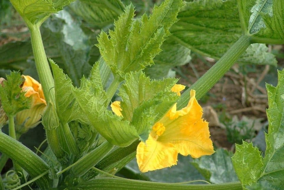 Close-up of a healthy zucchini plant with yellow blossoms growing in fresh soil.