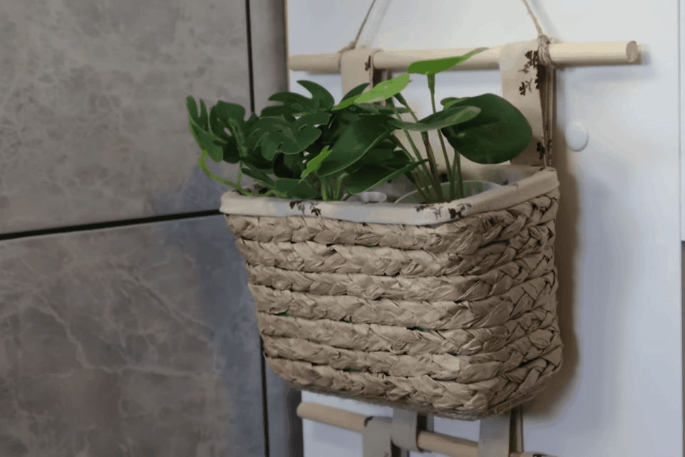 Taip pasigaminsite kompaktišką pakabinamą lentynėlę, kurią lengvai pritaikysite bet kuriame kambaryje. Joje patogu laikyti kosmetiką, kanceliarines priemones, rankdarbių smulkmenas ar kitus nedidelius daiktus. Kad vaizdas būtų dar jaukesnis, kompoziciją galima papildyti džiovintomis gėlėmis ar dekoratyviniais augalais.