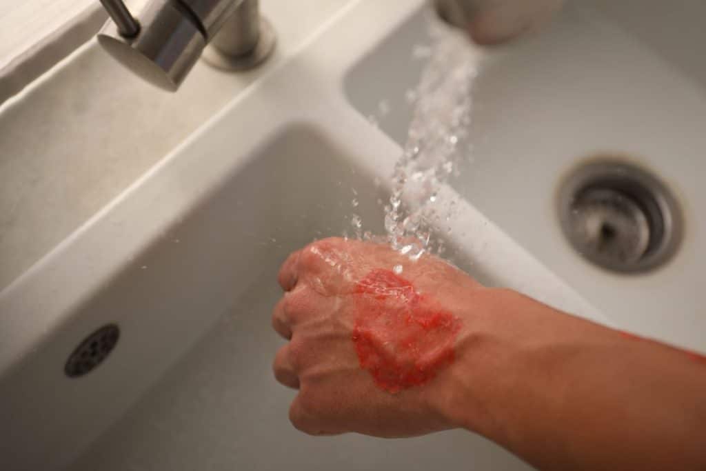 Pirmasis žingsnis – kuo skubiau atvėsinti nudegusią odos vietą. Tam geriausiai tinka vėsus vanduo, kuriuo galima nuolat drėkinti kompresą arba laikyti nudegusią vietą po tekančiu vandeniu.