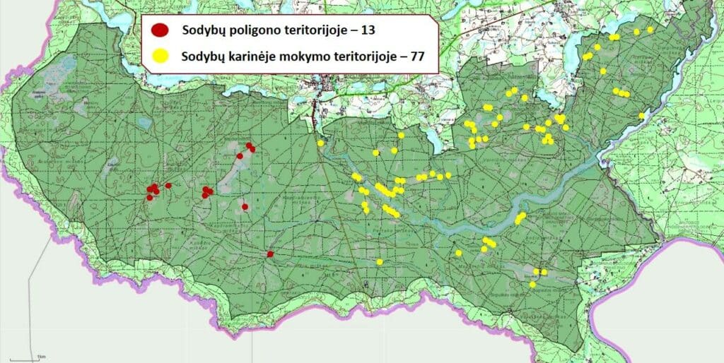 Vėliau Krašto apsaugos ministerija (KAM) nurodė, kad poligonas būtų padalintas į dvi funkcines dalis. Į visą numatomą poligono teritoriją patenka 90 sodybų – 13 iš jų priklausytų karinio šaudymo zonai, todėl gyventojai būtų iškeldinami.