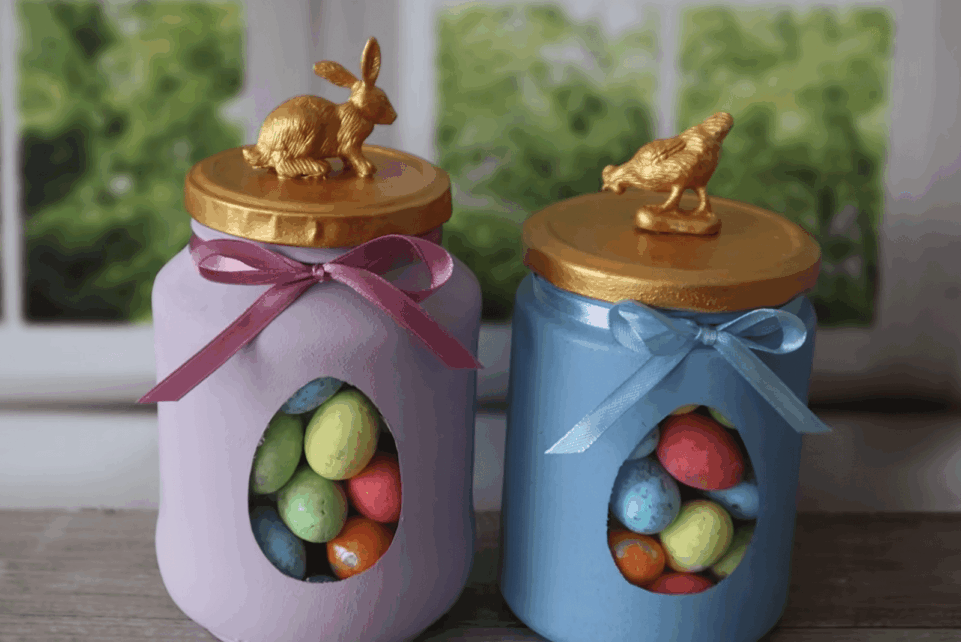 Viena paprastų, bet labai efektingų idėjų – šventinės stiklainėlių dėžutės saldumynams. Į jas patogu sudėti saldainius, sausainius, riešutus ar mažus šokoladinius kiaušinėlius, o pats vaizdas atrodo jaukiai ir pavasariškai.