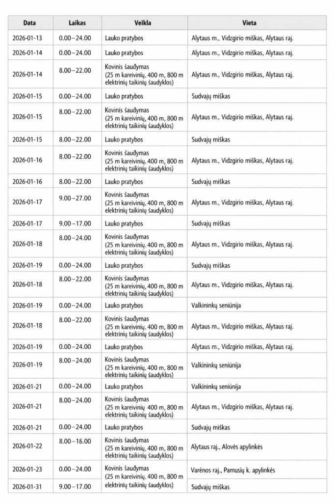 Kovinio šaudymo pratybos vyks Sudvajų miške Alytaus rajone. Jų metu bus aktyvuoti pavojaus zonos sargybos postai, siekiant užtikrinti civilių gyventojų ir pratybų dalyvių saugumą.