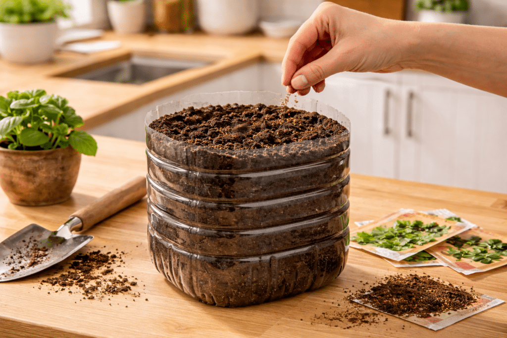 - Paruoškite žemę ir pasėkite. Apatinę butelio dalį pripildykite lengvos, laidžios žemės sėjai 7–10 cm aukščiu. Venkite trąšomis praturtintų substratų – jie gali pakenkti jautrioms sėkloms. Žemė turi būti drėgna, bet ne šlapia. Sėklas tolygiai paskleiskite paviršiuje ir užberkite plonu žemės sluoksniu pagal konkrečios rūšies reikalavimus.